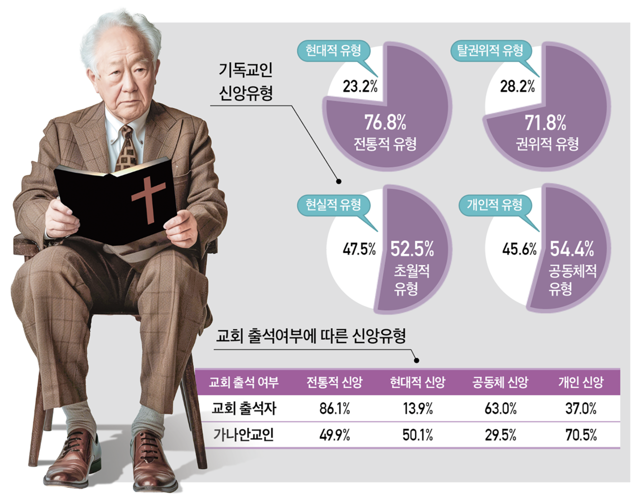 좀 더 세분화하면 스스로를 전통적 신앙인으로 응답한 사람은 40대 77.9%, 50대 76.9%, 60대 84.2%로 연령층이 높을수록 비율이 높았으며 현재 교회를 출석하는 신앙인 중 86.1%가 전통적 신앙, 가나안교인의 50.1%는 현대적 신앙을 선택했다.