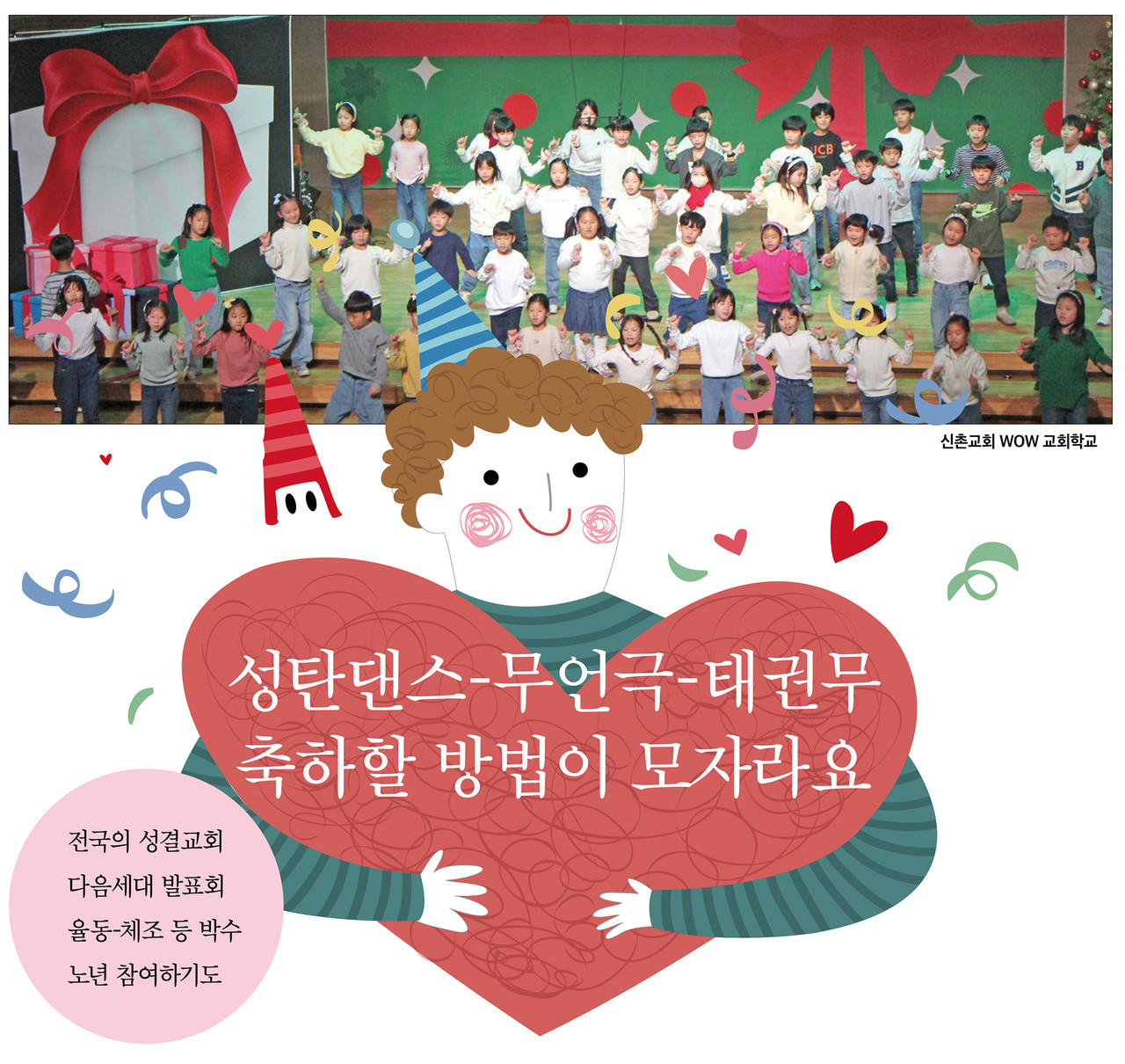 중앙교회(한기채 목사)는 이날 꿈의정원(교회학교) 성탄축하 발표회를 열고 찬양과 워십댄스, 무언극 등을 선보였다. 발표회에서는 영아부부터 청년부까지 모든 교육부서가 차례로 순서를 이어갔으며 흥인문학당과 아빠중창단은 자녀들과의 함께 ‘징글벨’을 불렀다. 흥인문학당 학생들은 찬양에 맞춰 태권무를 선보여 눈길을 끌었으며 우크렐레 연주도 했다. 중등부는 신앙적인 내용의 무언극 ‘내 마음의 버스’를 코믹하게 연출했다.