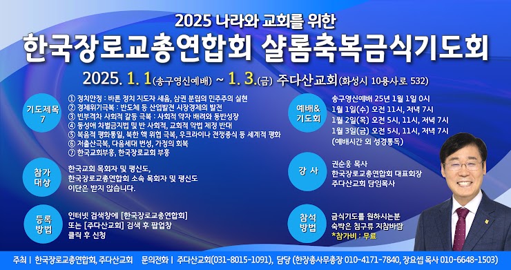 등록방법은 인터넷 검색창에서 한국장로교총연합회 또는 주다산교회를 검색한 후 팝업창 클릭 후 29일 주일저녁까지 신청하면 된다.