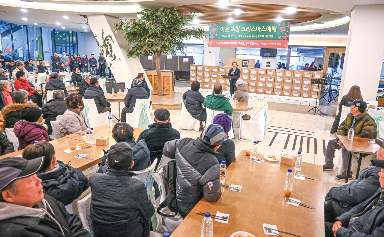 교회가 주최하고 한국기독교목회자협의회, 구세군, 다솜밥차가 후원한 ‘이웃 초청 크리스마스예배’에는 지역 정치인, 성동구청 및 성수동 주민센터 공무원, 성수지구대 관계자 등이 참석해 어르신들에게 인사하고 건강과 행복을 기원했다.