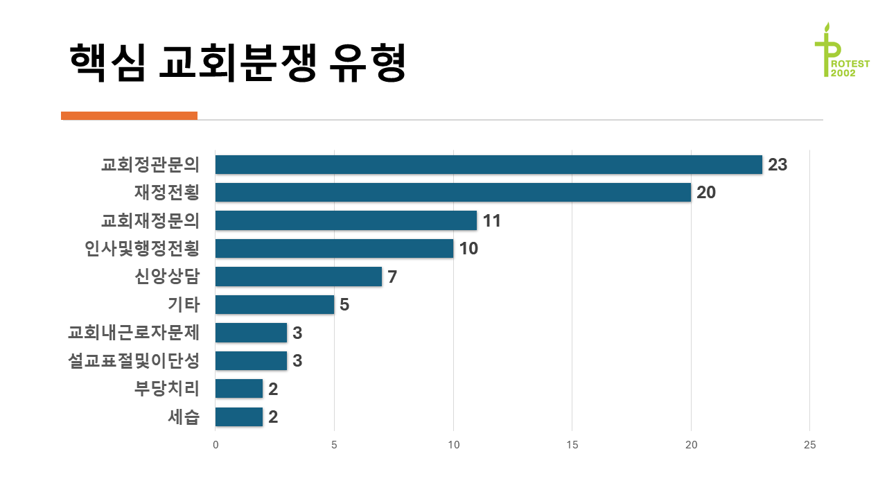 교회분쟁 유형 중 가장 많이 집계된 핵심 분쟁 유형은 ‘교회 운영 문의(정관 및 교단 헌법)’으로 26.7%였으며, 두 번째로 ‘재정 전횡(23.3%)’로 집계됐다. 이외에도 ‘교회 운영 문의(재정)’가 12.8%, ‘인사 및 행정 전횡’ 11.6%, ‘신앙 상담’ 8.1% 순으로 조사됐다. 교회분쟁의 배경으로는 ‘인사 및 행정 전횡(35.2%)’, ‘목회자 비윤리(18.5%)’ 등으로 나타났다.