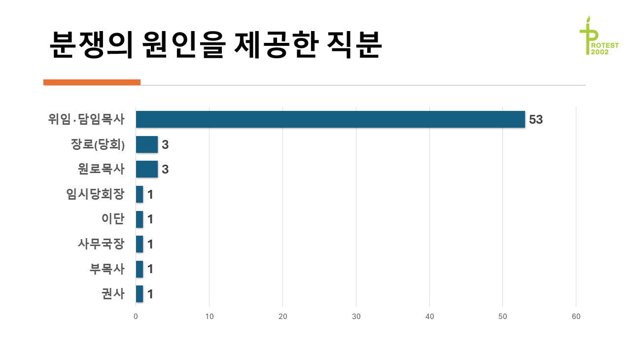 교회 분쟁의 원인을 제공한 인물의 직분으로는 ‘위임·담임목사’인 경우가 82.8%를 차지했다. 분쟁에 동조하는 인물의 직분은 ‘장로(당회)’ 44.2%로 1위를 차지했으며, ‘원로목사’ 13.5%, ‘노회(총회)’, ‘목회자 가족’, ‘집사’가 각각 7.7%로 조사됐다.
