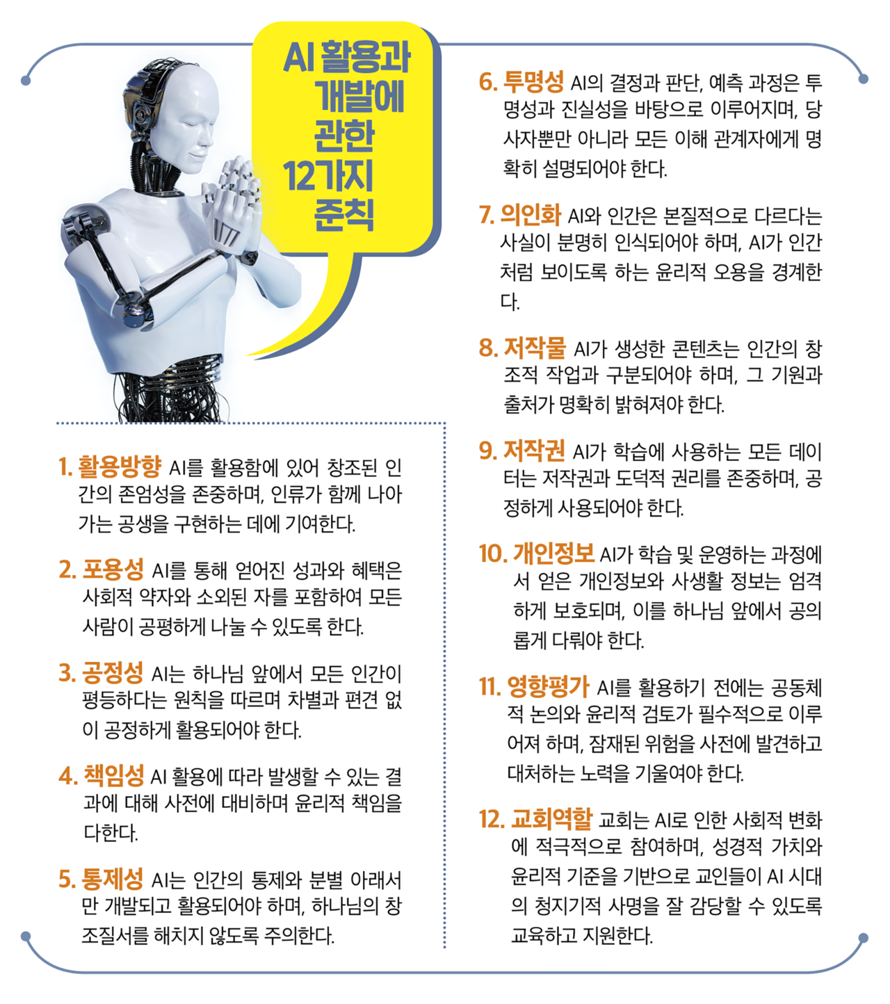 이어 통제성에서는 “인간의 통제와 분별 아래서만 개발되고 활용되어야 하며 하나님의 창조질서를 해치지 않을 것을 주의해야 한다”, 의인화에는 대해서는 “AI가 인간처럼 보이도록 하는 윤리적 오용을 경계할 것”을 담았다.