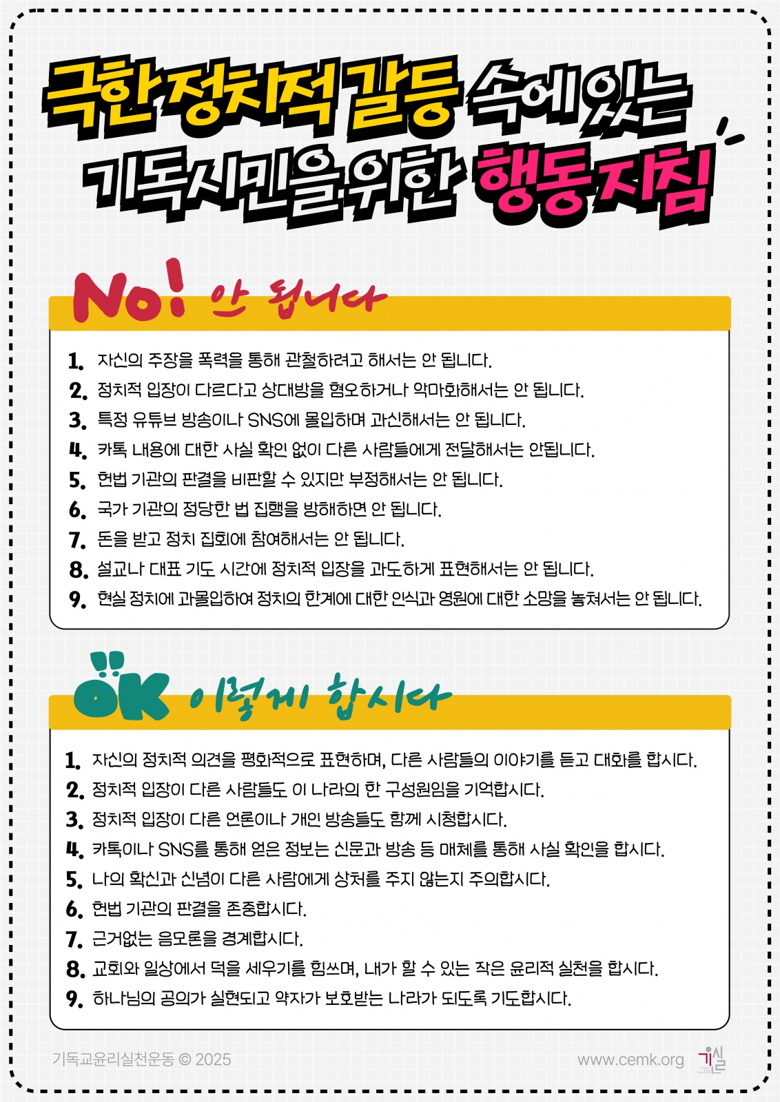 행동지침에서는 우선적으로 상식적이면서 법을 준수하는 기독시민으로서 지양해야 할 사안들을 정리했다. 악의적인 내용이 담긴 가짜뉴스를 무차별적으로 전달한다거나 최근에 벌어진 서부지법 습격처럼 폭력을 행사해서는 안 된다는 것이다.