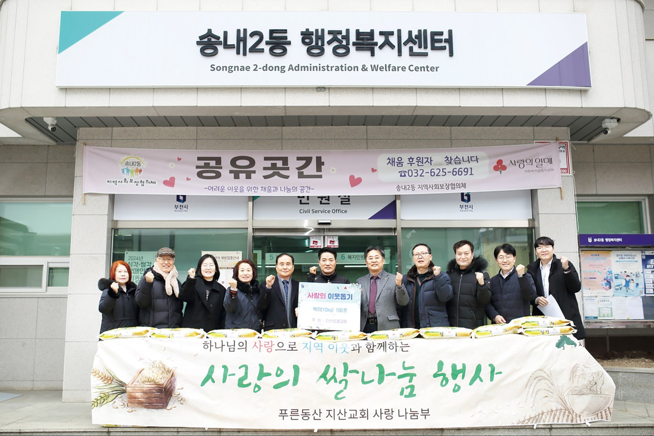 지산교회는 올해도 설을 맞아 지난 1월 16일 송내동주민센터에 사랑의 쌀 20㎏ 100포를 전달했다. 매년 명절마다 쌀 기부를 통해 지역사회와 함께하고 있다.
