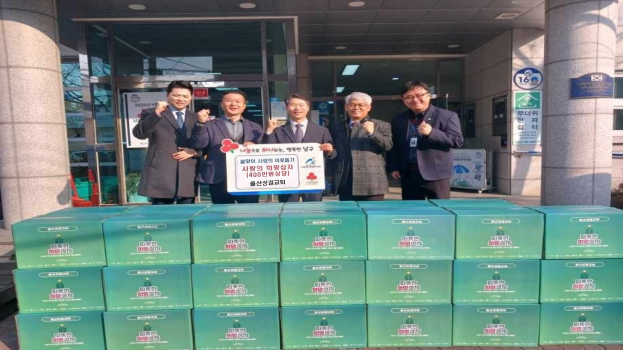 울산교회(한대수 목사)는 지역사회와 선교지를 향한 사랑을 실천하기 위해 설을 앞둔 지난 1월 22일 기아대책 희망상자 40개(400만 원 상당)를 울산 남구 신정4동에 전달했다. 이번에 전달한 희망상자는 지역 내 소외된 이웃들에게 전달됐다.