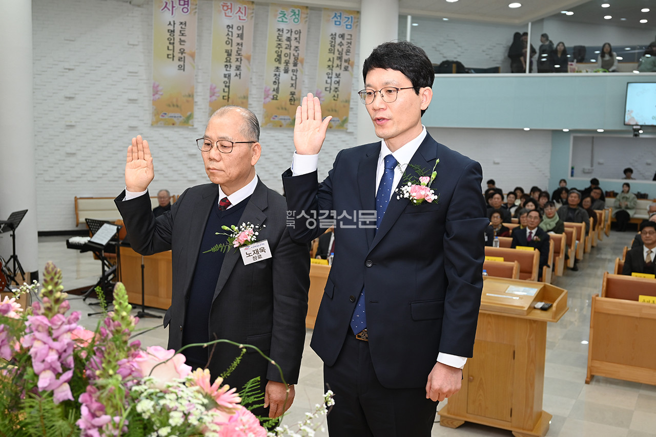 이어진 담임목사 취임식을 위해 부회장 변명구 목사가 기도했으며 윤여훈 담임목사와 교회대표 노재욱 장로가 서로의 책임과 의무를 다 할 것을 엄숙히 서약한 후 지방회장이 치리권을 부여하고 공포했다. 명예장로 추대식은 구영준 목사(샛별교회)의 기도, 윤병선 장로의 소개 및 추대사 및 담임목사의 공포로 진행됐으며, 각 기관 대표들이 담임목사와 명예장로에게 추대패와 꽃다발을 증정했다.
