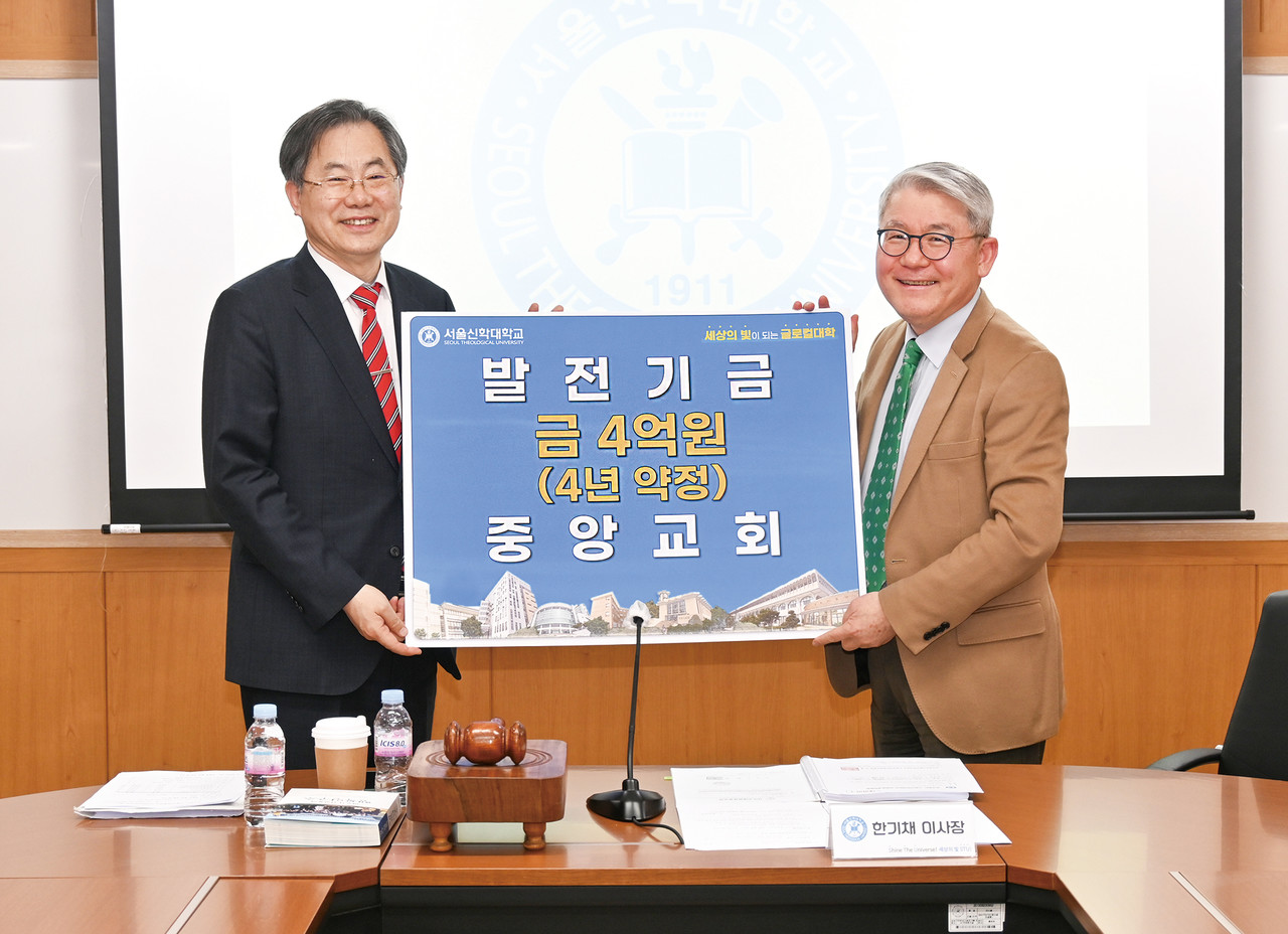 중앙교회(한기채 목사)가 서울신대 발전기금으로 4억원을 약정했다. 중앙교회는 지난 2월 20일 열린 이사회에서 4년간 매년 1억원씩 발전기금을 전달할 것을 약속했다.