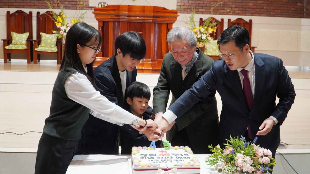 축하케익 커팅과 45년 전 교회 창립을 함께했던 세 명의 성도에게 손기봉 목사가 감사패와 금일봉을 전달하며 감사의 마음을 전했다. 이후 전 교인이 함께 모여 사진을 촬영하며 45주년을 기념했다.