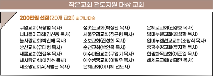 선정 기준은 전도자 준비, 대상자 이해, 전도의 통로, 복음의 전달 등이었으며 각자 20곳을 추천해 가장 많은 심사위원에게 선정된 교회 순으로 최종 선발했다.