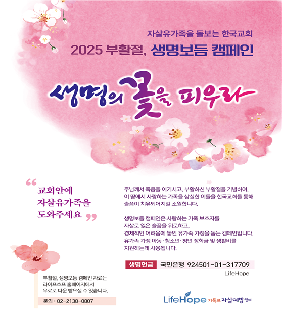 Lifehope기독교자살예방센터(대표 조성돈, 이하 라이프호프)는 사순절 및 부활절 캠페인으로 ‘생명의 꽃을 피우라’를 진행한다.