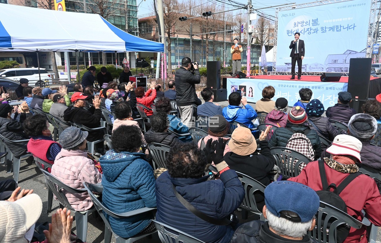 인천서지방 금곡교회(박대성 목사)가 지난 3월 15일 인천 송림동 현대시장 활성화를 위한 행사를 진행했다. 금곡교회는 지난 해 현대시장 화재 1주기를 맞아 위로회를 열었는데, 올해는 침체된 경제 상황에 처한 상인들을 격려하기 위해 마련한 자리다.