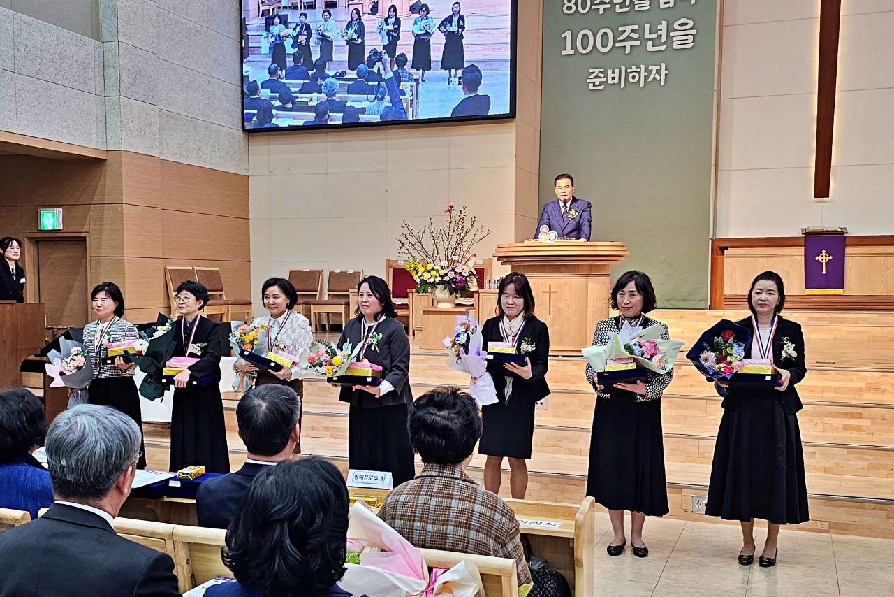 2019년 나란히 장로장립해 함께 시무해 온 신동수 김긍용 장로는 이날 명예장로로 추대받아 은퇴도 동시에 했다. 신동수 명예장로는 교회학교 부흥에 힘쓰며 재정위원 시온찬양대원으로 섬겼고, 김긍용 명예장로는 경조위원장, 관리위원장, 시온찬양대장으로 헌신했다. 뒤이어 김기석 서건이 손석교 강정심 오인순 이순례 이춘자 이희정 최영수 홍미선 씨는 명예권사로 추대받았다. 성도들은 교회 부흥과 발전을 위해 오랫동안 헌신한 이들의 명예로운 은퇴를 박수치며 축하했다.