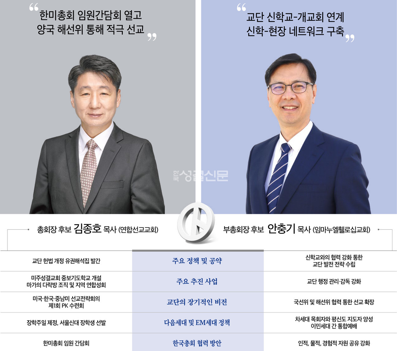 총회장 후보로 입후보한 김종호 목사(연합선교교회)와 부총회장 후보 안충기 목사(임마누엘휄로십교회)는 각각 출마의 변과 공약을 발표하며 ‘화합과 개혁’, ‘미래 준비와 현장 소통’을 핵심 키워드로 내세웠다.
