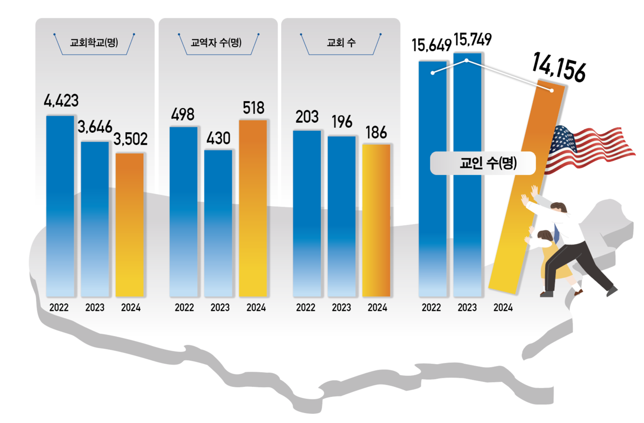 반면에 교회학교 수(대학+중고등부+유초등부+영유아부)는 지난 해 3.646명에서 144명이 감소한 3,502명으로 집계됐다. 교회학교 인원은 2022년 4,423명, 2023명 3,646명, 2024년 3,502명으로 매년 줄어드는 추세다. 교회학교 수가 가장 많은 지방회는 동남지방회로 총 1,995명이며 캐나다지방회 383명, 동부지방회 351명 순이다.