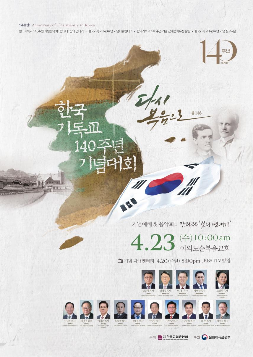 한국교회총연합(대표회장 김종혁 목사, 이하 한교총)이 주최하고 문화체육관광부가 후원하는 ‘한국기독교 140주년 기념대회’가 한국기독교 140주년 기념 다큐멘터리를 시작으로 한국기독교 140년의 발자취를 되새기며, 미래를 향한 여정을 시작한다.