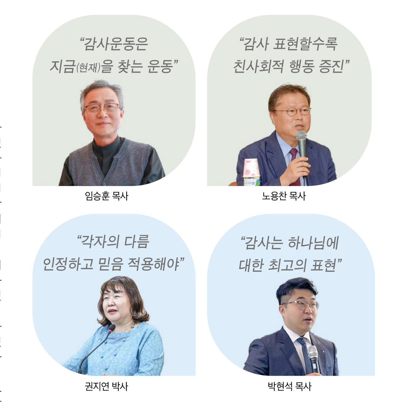 또 임 목사는 감사운동을 ‘작은 것부터 회복하는 운동’으로 소개했다. 주변의 작은 것에 충실할 때 더욱 큰 것을 이뤄가고 하나씩 성취하면서 감사를 고백하게 된다는 의미다.