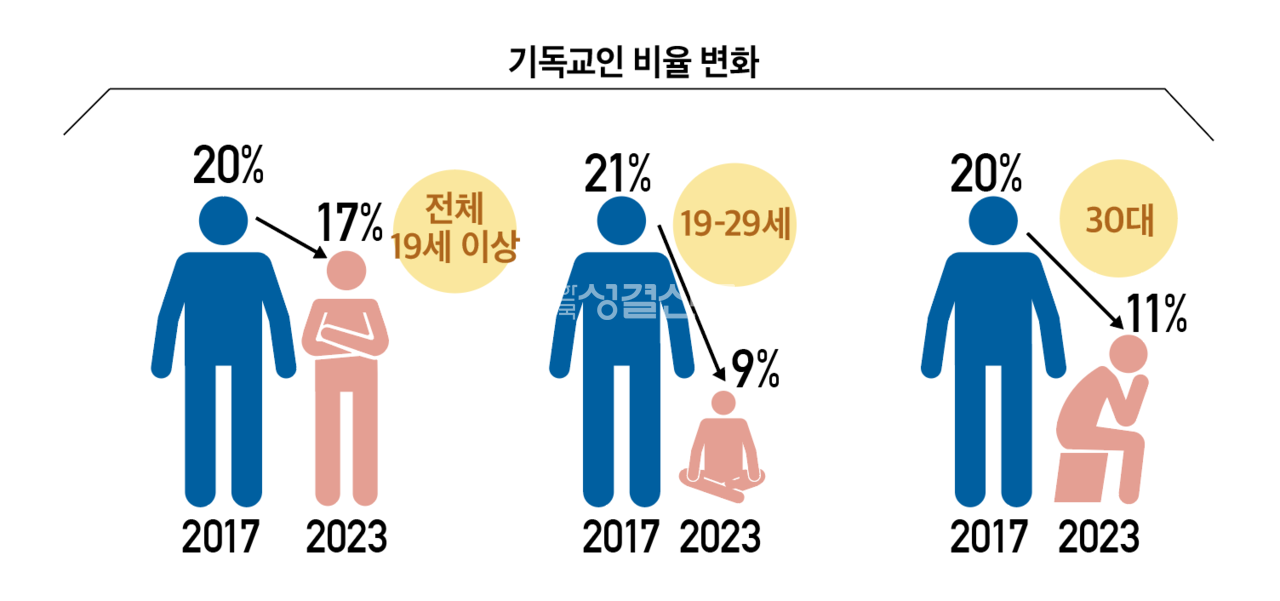 이와 같은 청년층의 전반적 사회적 위기와 맞물려, 기독청년 인구는 더욱 빠른 속도로 줄어들고 있다. ‘2023 국민 종교 분포 및 현황 조사’에 따르면, 20대 중 기독교인은 9%, 30대는 11%로 나타났다. 이는 2017년 조사 당시의 절반 수준이다. 20년 전인 2004년과 비교하면 무려 3분의 1 수준으로 급감한 셈이다.