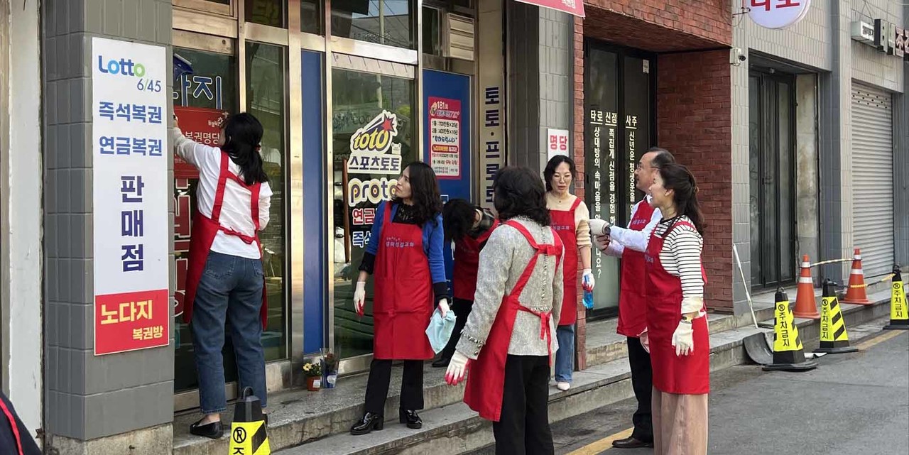 올해도 주일 2부 예배 후 교회 앞마당에 모인 성락성결교회 교인들은 빨간색 앞치마를 두른 채 거리청소와 더불어 꽃길을 조성하고 가게 200여 곳에 화분을 전달했다. 또 가게 유리창을 닦아주는 등 주민들을 위해 정성껏 봉사했다