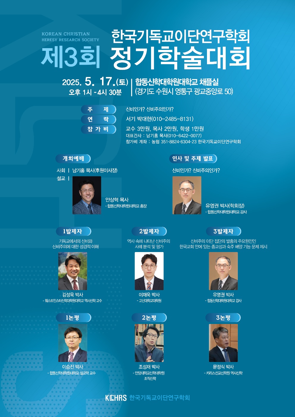 한국기독교이단연구학회(회장 유영권 목사)가 주최하는 제3회 정기학술대회가 오는 5월 17일 합동신학대학원대학교 채플실에서 개최된다.