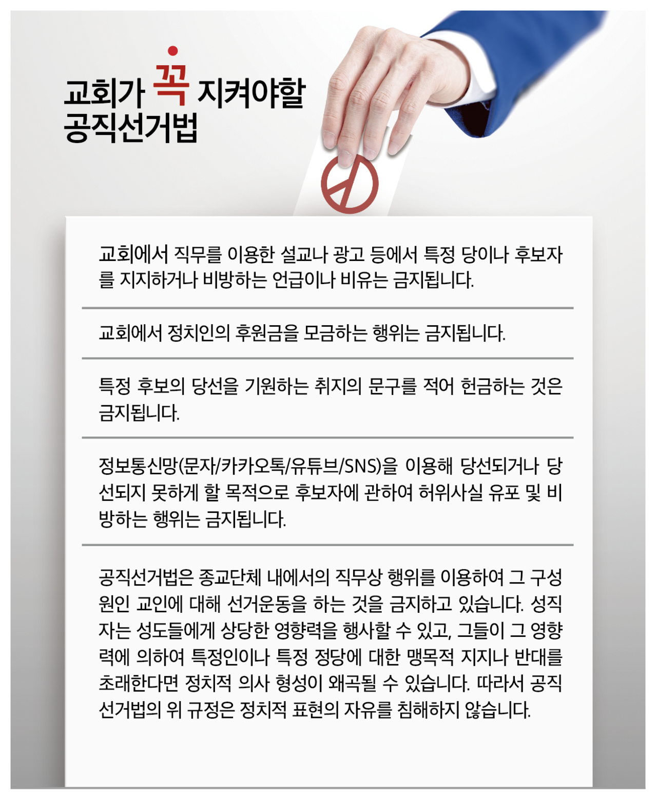 제21대 대통령 선거 운동이 지난 5월 12일부터 본격적으로 시작된 가운데 한국교회도 기독교 가치에 입각한 정책 제안과 공정한 선거문화 정착을 위한 움직임에 나섰다. 한국기독교공공정책협의회는 10대 정책을 각 당에 전달했으며, 기독교윤리실천운동은 공직선거법 준수와 신중한 투표를 위한 ‘TALK PRAY VOTE 캠페인’을 전개하고 있다. 각 단체들은 그리스도인의 책무로서 바른 정치 참여와 민주 시민 의식을 강조했다.