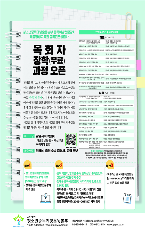 이에 청예본은 중독예방 전문강사 100시간 과정에 담임사역 중인 목회자들에게 전액 장학 지원을 제공하기로 했다. 이 과정은 청예본이 새움평생교육원과의 업무협약(MOU)을 통해 공동 운영하며, 수료 시 중독전문상담사 자격증 응시를 위한 추가 80시간 무료 교육 기회도 주어진다.