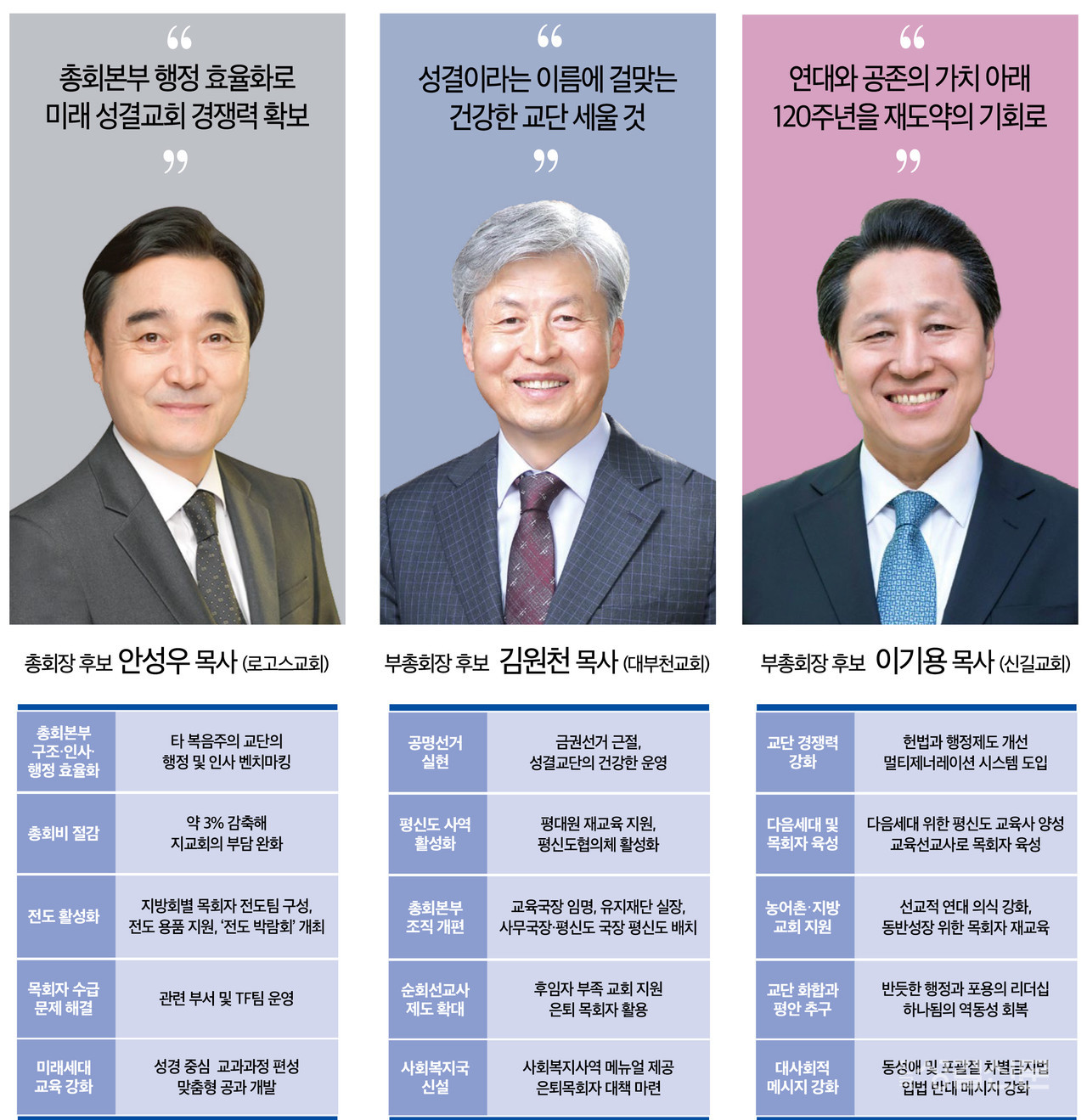 총회장 후보 안성우 목사와 장로부총회장 후보 안보욱 장로, 서기 후보 김요한 목사(은산제일교회), 회계 후보 조성환 장로(공주교회), 부서기 후보 홍지명 목사(호원교회)는 단독 후보로 투표없이 당선이 공포되며 부회계 후보 기호 1번 김승모 장로(대전선화교회)와 기호 2번 신진섭 장로(서울교회)는 경선을 통해 당선 여부를 가린다.