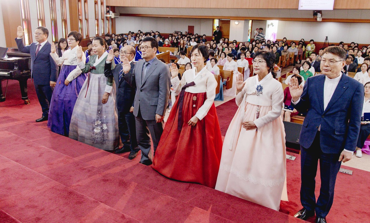 설교 후에는 부회장 황정현 목사의 기도로 장로장립식과 권사취임식, 집사안수식이 차례로 진행되었다. 신임 장로들에게는 선배 원로장로들이 기념품을 전달했고 권사취임식에서는 신임 장로 4명을 포함해 20명의 시무장로들이 신임 권사들에게 안수기도를 해 눈길을 끌었다. 또 6명의 명예장로들은 6명의 안수집사들에게 기념품을 전달하며 이전보다 더 큰 헌신을 당부했다.