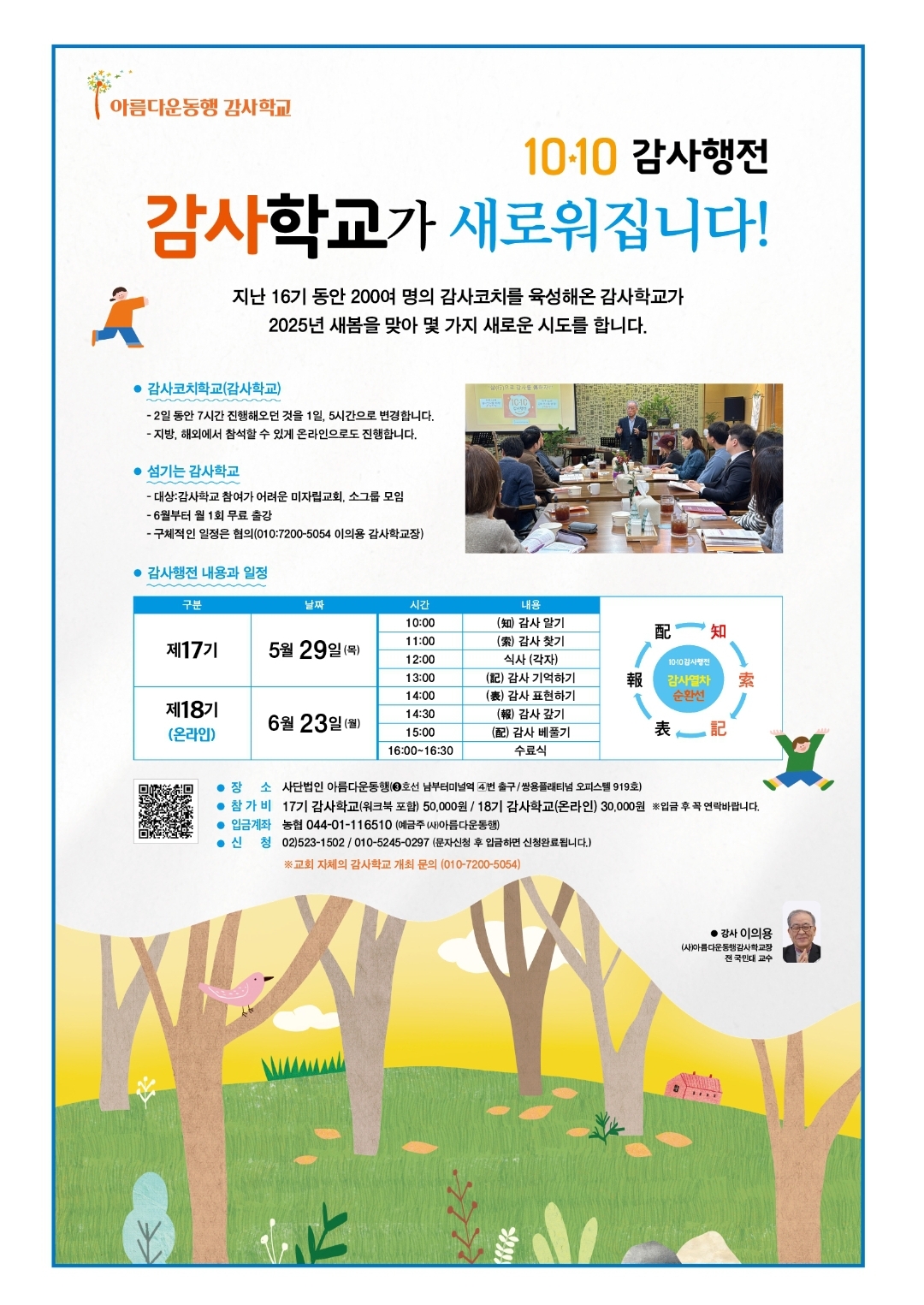 올해 제17기 감사학교는 오는 5월 29일 오전 10시부터 진행되며, 제18기는 6월 23일 온라인으로 열린다. 일정은 감사읽기, 감사강의, 감사 편지쓰기, 감사 표현하기 등으로 구성되었으며, 감사 실천 중심의 프로그램이 돋보인다. 교육비는 대면 기준 5만원, 온라인은 3만원이다.