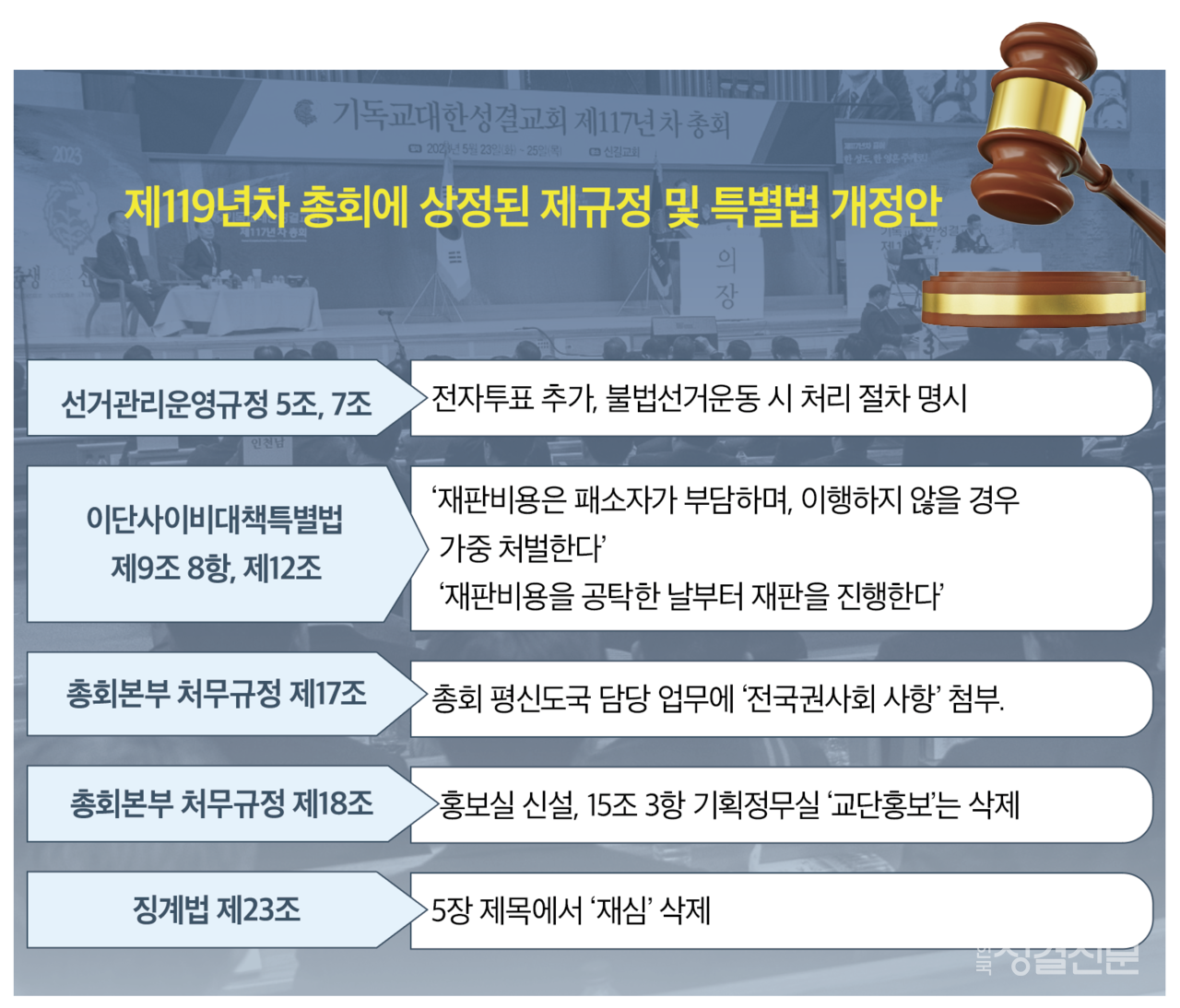 가장 주목받는 안건은 총회 임원선거에서 전자투표 절차를 도입하는 내용이다. 선거관리위원회는 선거관리운영규정 제5조(선거관리)와 제7조(불법부정선거 처리) 일부를 개정해 제출했으며, 전자투표 방식을 명문화하고 불법선거운동 발생 시 처리 절차를 명확히 했다. 이는 교단 내 선거의 공정성과 효율성 확보를 위한 제도 개선 시도로 해석된다.
