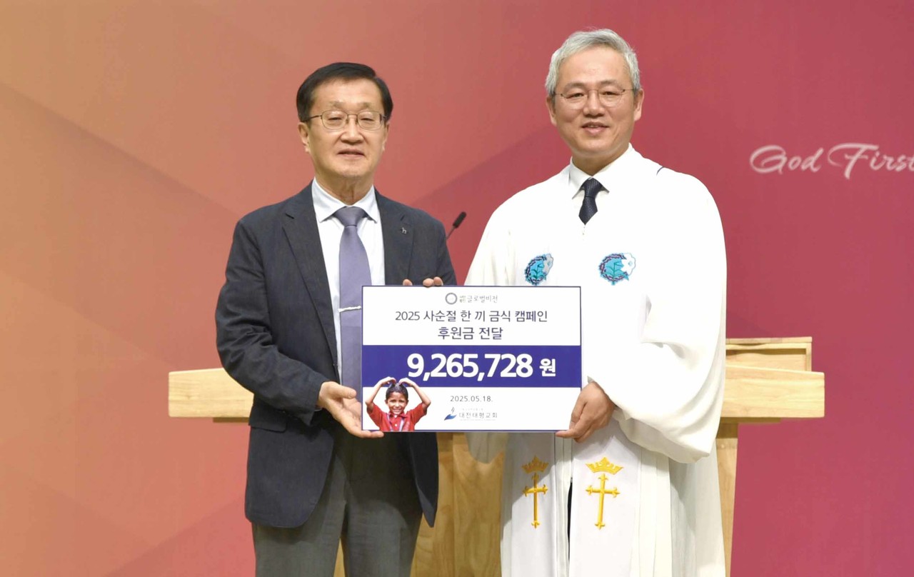 지난 5월 18일 대전태평교회는 주일 낮예배에서 (사)글로벌비전(회장 이기현)에 사순절 한 끼 금식 헌금 9,265,728원을 전달했다. 이 헌금은 본지와 글로벌비전이 함께 진행한 ‘사순절 한 끼 금식 캠페인’을 통해 마련한 것으로, 전교인이 동참해 모은 것이다.