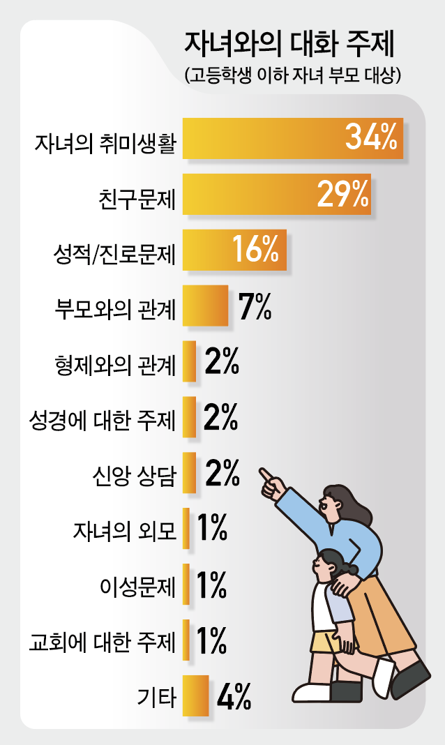 자녀와의 관계 안에서 신앙이 자연스럽게 스며들기보다는 학업, 진로, 취미 등 세속적 주제 중심으로 이루어지고 있는 현실도 드러났다.