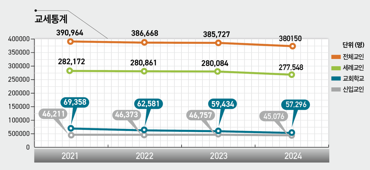 2024년 세례교인 수는 27만7,548명으로 지난 해 28만 84명에 비해 2,500명 가량 줄어든 것으로 보고됐다. 우리 교단의 세례교인 수는 2018년 처음으로 30만명 이하를 기록한 후 매년 줄어들고 있다.