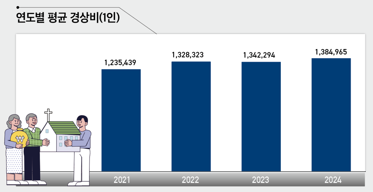 총회 전체 경상비는 3,067억 8,535여 만원이고 1인당 평균 경상비는 1,384,965원으로 전년에 비해 약 4만2,000원 정도 늘었다.