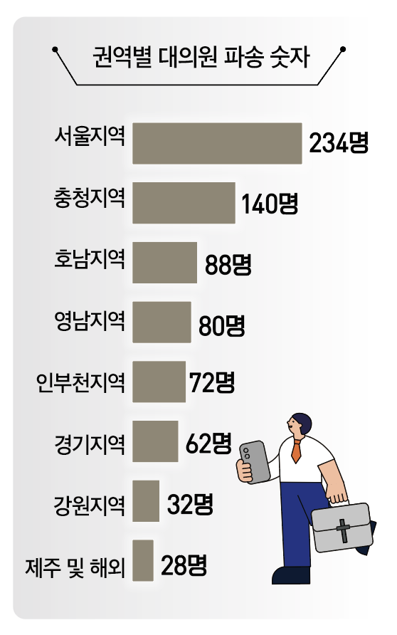 국내 총회대의원 소속 지방회를 권역별로 구분하면 서울지역이 234명(31.8%)으로 가장 많았다. 뒤를 이어 충청지역 140명(19.0%), 호남지역 88명(11.9%), 영남지역 80명(10.8%), 인부천지역 72명(9.8%) 순이다.