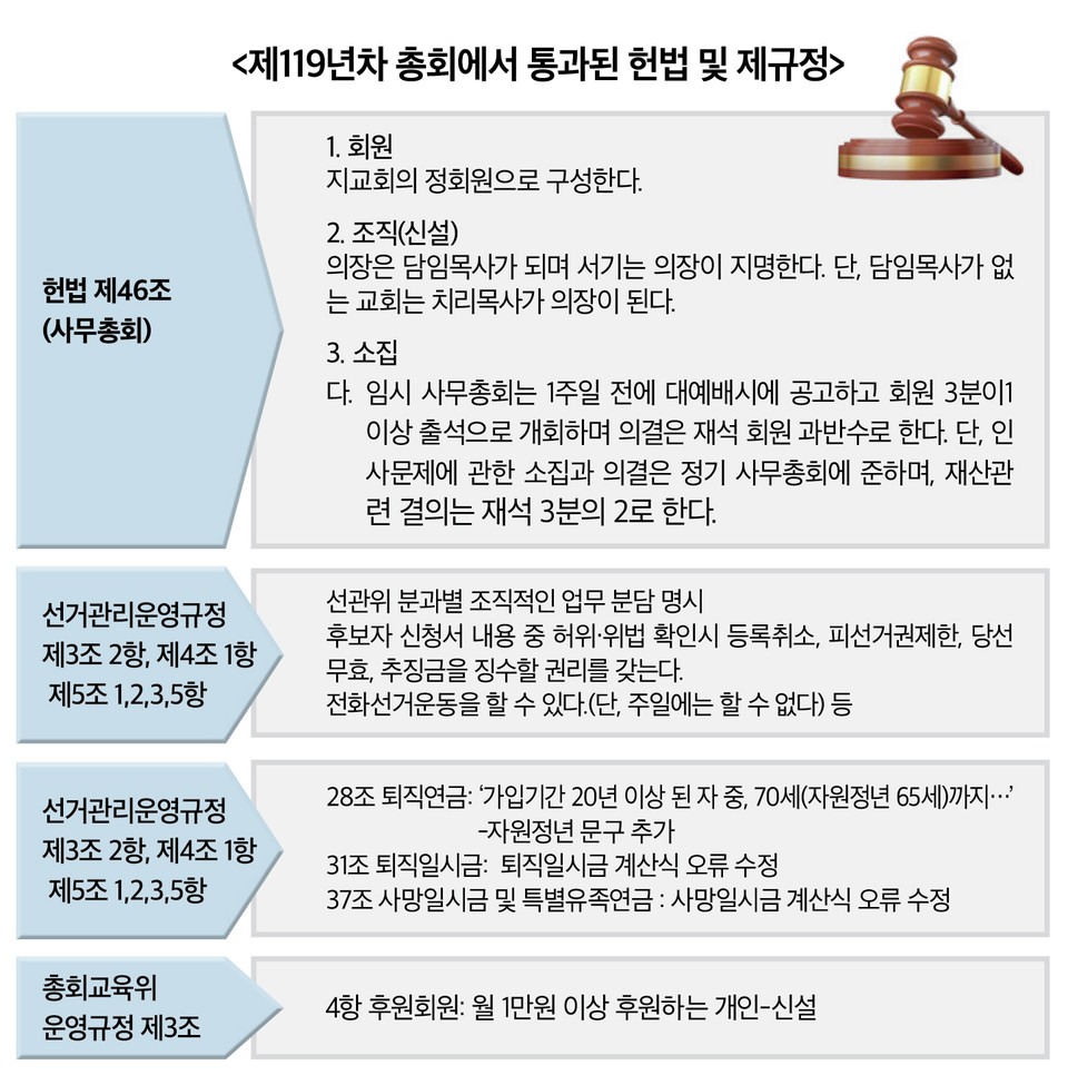 또 1항(회원)은 ‘지교회의 정회원으로 구성한다’로 간소화하고, 2항(조직)을 신설해 ‘의장은 담임목사가 되며, 서기는 의장이 지명한다. 단, 담임목사가 없는 교회는 치리목사가 의장이 된다’는 조항이 추가됐다.