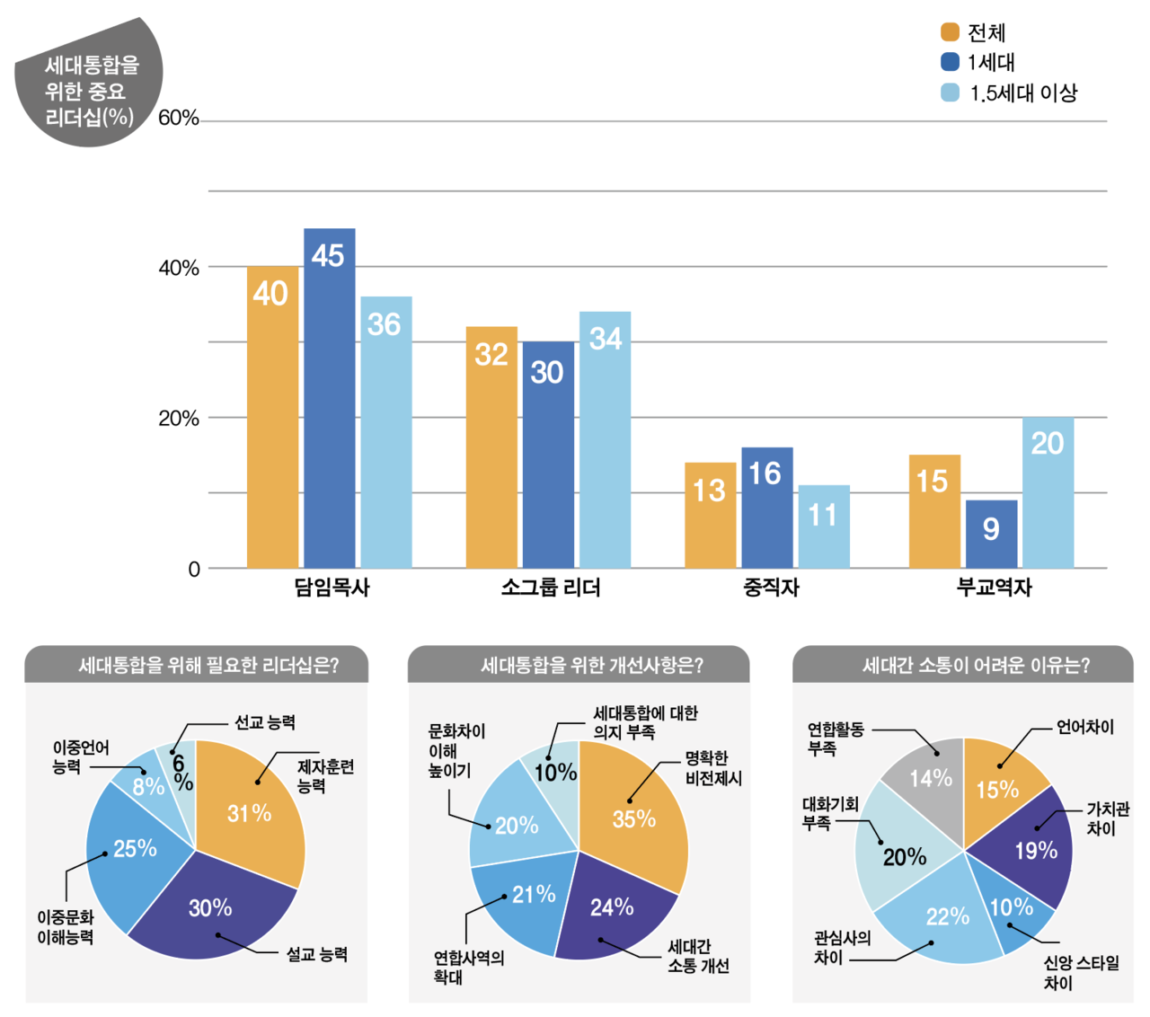 세대 통합을 위해 가장 중요한 리더십을 묻는 질문에 응답자의 40%는 담임목사라고 답했다. 이어 소그룹 리더(32%), 부교역자(15%), 중직자(13%) 순이었다. 담임목사와 부교역자를 더하면 총 55%로 목회자의 리더십이 중요한 것을 알 수 있다.