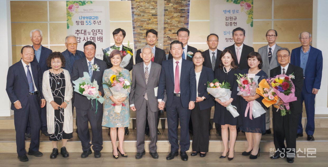올해 11월, 교회 창립 55주년(1970년 설립)을 맞이하는 나성교회는 이날 임직식을 통해 믿음의 사역을 새롭게 다짐했다. 예식은 이성수 목사의 집례로, 지방회 회계 조동환 장로가 기도하고, 서기 이진경 목사가 성경을 봉독했다. 이어 지방회장 이대연 목사가 ‘작고 적은 일에도 충성하라’는 제목으로 말씀을 전했다.