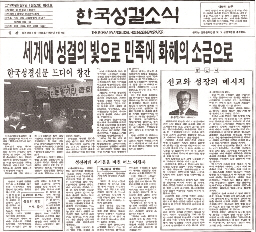 창간호 1면에는 당시 총회장 홍종현 목사의 창간사가 실렸다. 창간사는 “언어는 시대의 혼이고 신문은 사회의 거울”이라는 문장으로 시작해, 교단지 창간의 이유와 시대적 사명을 짚었다. 특히 “성결의 빛으로 세계를, 화해의 소금으로 민족을 품자”는 방향 제시는 곧 창간 사시로 자리 잡았다.