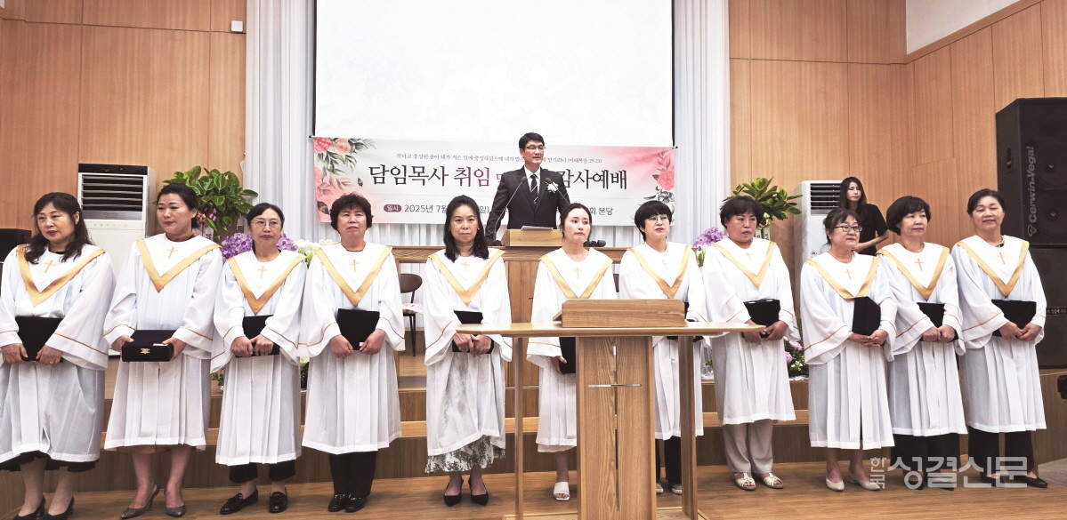 이어진 임직 예식에서는 김경진 이현정 김선숙 박미리 박순향 박순분 사예진 이원화 어미자 최혜란 최윤정 씨 등 총 11명이 권사로 취임했으며 강병현 김남규 씨가 안수집사로 세워졌다.