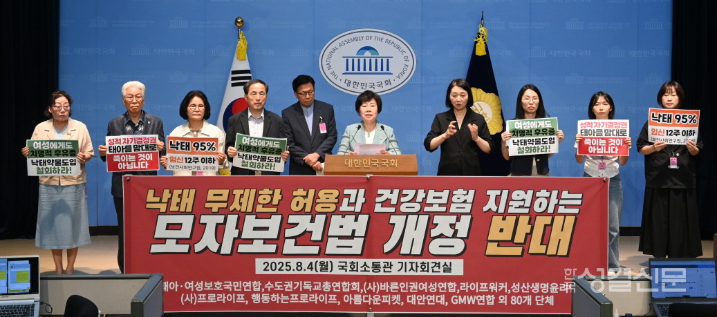 수도권기독교총연합회, 성산생명윤리연구소, 프로라이프, 라이프워커 등 69개 단체로 구성된 태아·여성보호국민연합은 이날 기자회견에서 “일 년에 100만 명씩 태어나던 우리나라는 2024년에 태어난 신생아 숫자가 24만 명에 불과할 정도로 감소했다”며 “무제한 낙태를 허용하고 모든 낙태 비용을 건강보험으로 지원하면 대한민국은 결국 소멸 위기에 놓일 것”이라고 지적했다.