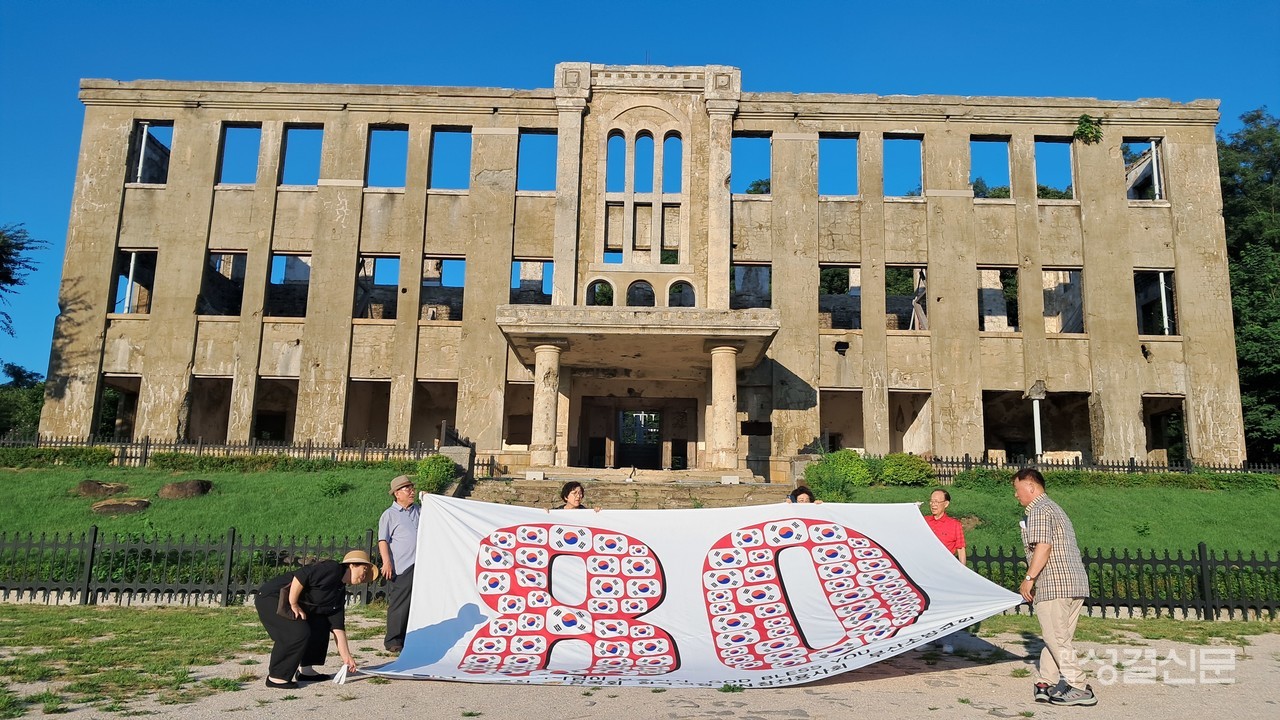 원승재 목사(부산소망교회 원로)와 항일 독립운동 및 한국전쟁 참전용사 유족들이 지난 8월 8일 강원도 철원 노동당사를 찾아 광복 80주년을 축하하는 퍼포먼스를 선보였다.