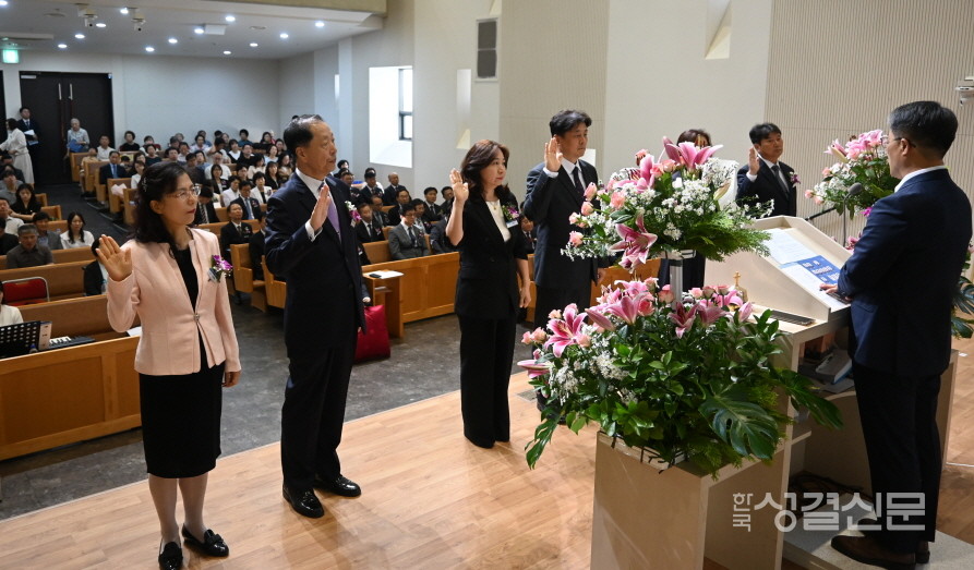 길웅철 김용남 김창우 씨 등 5명은 안수집사로 임직하고 문광억 씨는 안수집사로 취임했다. 김명숙 김진선 박선미 씨 등 11명은 권사로 취임했다. 임직자들은 서약을 통해 교회와 성도들을 섬기고 예배와 기도, 심방, 봉사 등 신앙의 모범을 보이며 충성을 다할 것을 서약했다.
