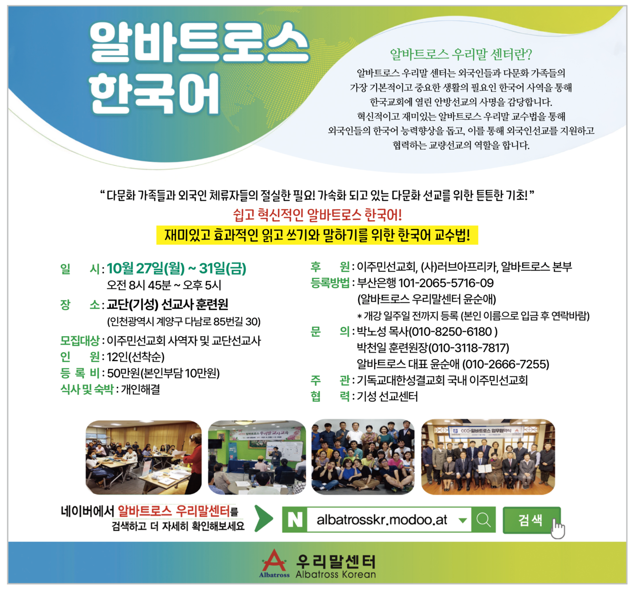 알바트로스 우리말센터(대표 윤순애)가 오는 10월 27~30일 인천 기성선교센터에서 알바트로스 한국어 훈련을 진행한다. 이번 과정은 다문화 가정과 외국인 체류자들이 한국 사회에 안정적으로 적응하고 교회 공동체 안에서 신앙생활을 이어가도록 돕기 위해 마련됐다.