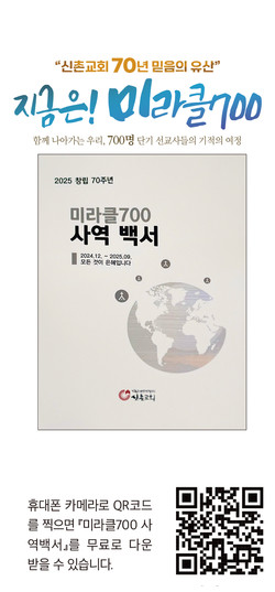 신촌교회(박노훈 목사)가 창립 70주년을 맞아 전 성도가 함께한 ‘미라클700’을 마치고, 그 모든 과정을 기록한 『선교 백서』를 펴냈다.