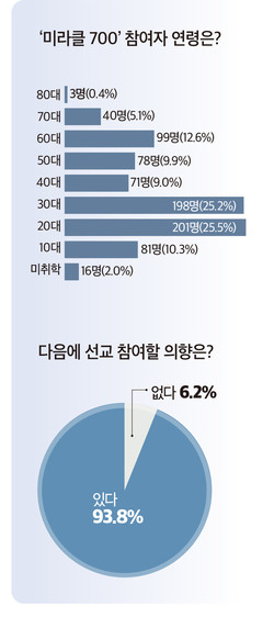 백서는 참가자 설문조사를 통해 ‘미라클700’의 성과를 수치로 확인했다. 장년부 참가자 382명 가운데 266명이 응답해 69.6%라는 높은 응답률을 기록했다. 무엇보다 눈에 띄는 것은 응답자의 60% 이상이 생애 처음으로 단기선교에 참여했다는 점이다. 그럼에도 불구하고 만족도는 높았고, 대부분 “다시 참여하겠다”고 답했다.