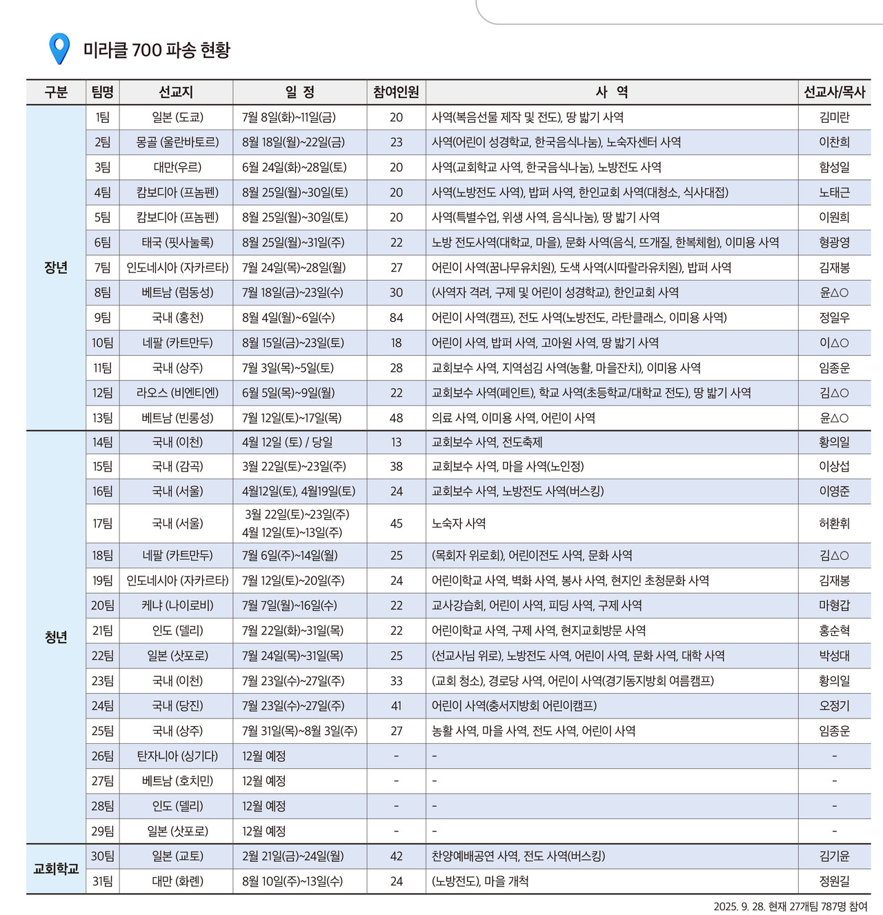 올여름 총 27개 팀이 파송됐고, 참가 인원은 787명이었다. 그러나 중요한 것은 수적 확대가 아니다. ‘미라클700’은 교회 정체성을 다시 쓰는 선언이었다.