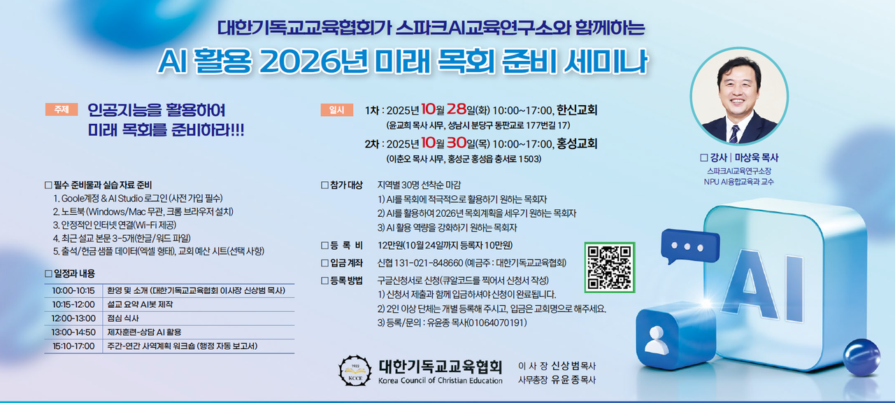대한기독교교육협회(이사장 신상범 목사, 사무총장 유윤종 목사)가 스파크AI교육연구소(소장 마상욱 목사)와 함께 오는 10월 ‘AI 활용 2026년 미래 목회 준비 세미나’를 개최한다. 이번 세미나는 급변하는 디지털 환경 속에서 인공지능을 활용한 목회 전략을 모색하고, 2026년을 바라보는 미래 목회 청사진을 제시하기 위해 마련됐다.
