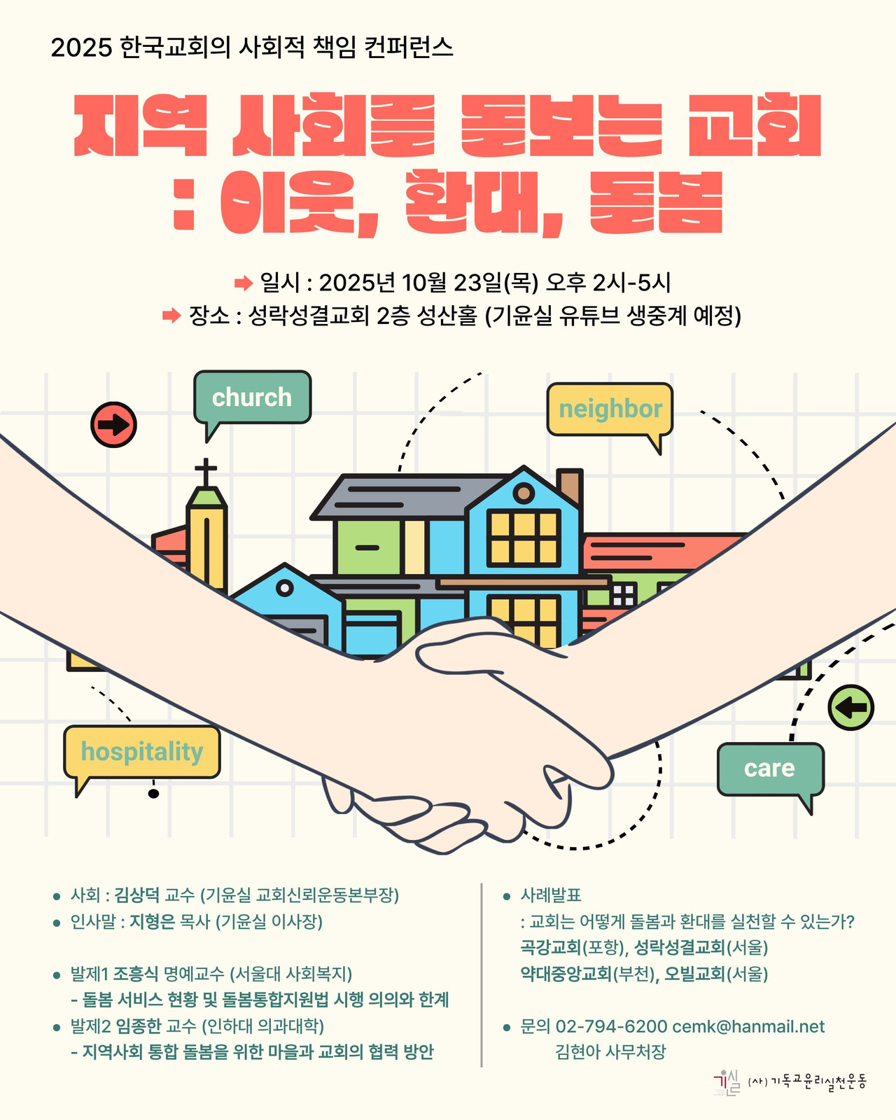기독교윤리실천운동(이사장 지형은 목사, 이하 기윤실)이 오는 10월 23일 오후 2시부터 5시까지 성락성결교회 성산홀에서 ‘2025 한국교회의 사회적 책임 컨퍼런스’를 개최한다. 이번 컨퍼런스는 ‘지역 사회를 돌보는 교회 : 이웃, 환대, 돌봄’을 주제로 진행되며, 기윤실 유튜브 채널을 통해서도 생중계된다.