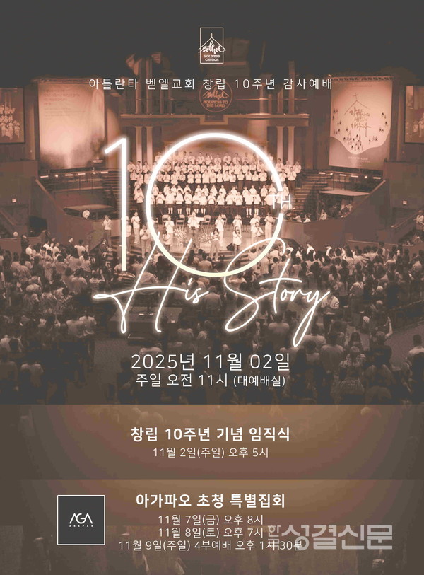 한편 아틀란타 벧엘교회는 창립 10주년을 기념해 11월 7-9일 아가파오 초청 특별집회도 열고 부흥의 은혜를 되새길 예정이다.